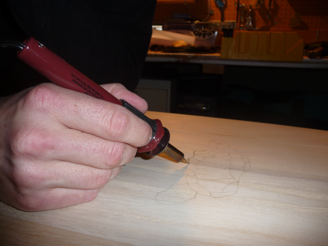 Thank you to my wife Jen for drawing the turtle, transferring it to the board and trusting me to burn it in. For those interested, I used a Creative Versa-Tool Kit - 120V/ 25-Watt (made by Walnut Hollow) purchased for about $25. I used the tapered point and lightly followed the penciled-on drawing. As the wood became scored, I could press harder to get the burn and depth I wanted. After about 10 minutes the tip was so heated-up it actually bent a little (causing a minor blemish).